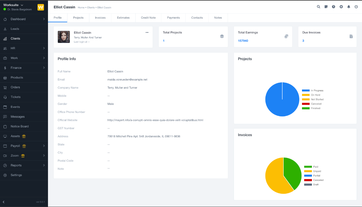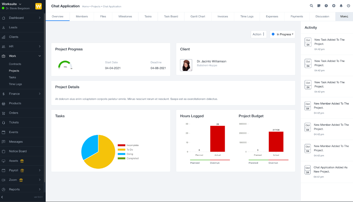 Create projects, add project members, and track progress, expenses, earnings, timelogs, tasks, and milestones