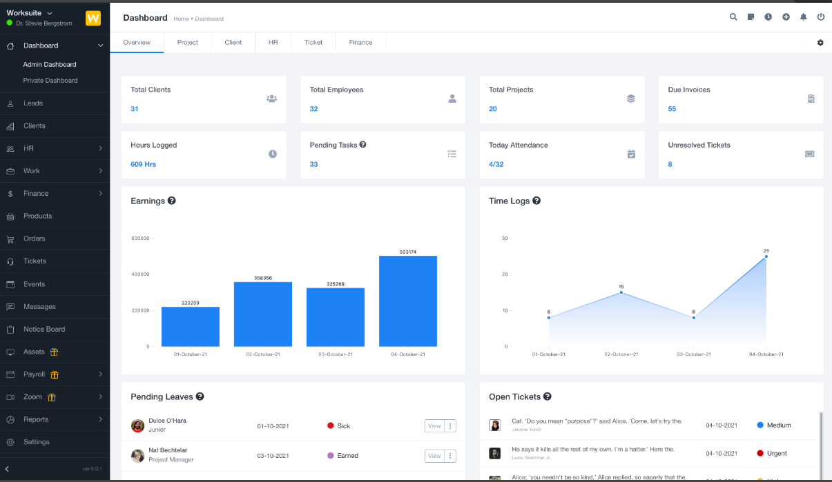 Various reports for tasks, timelogs, finance, attendance, and leaves